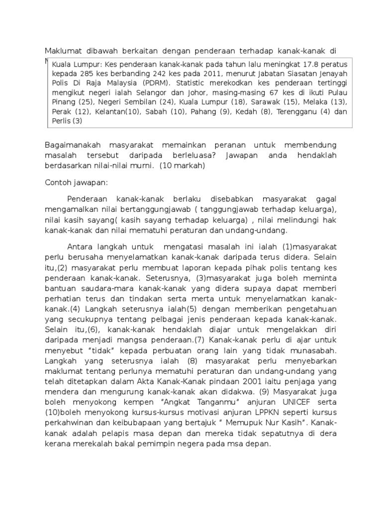 Download lagu penderaan kanak (12.36mb) dan streaming kumpulan lagu penderaan kanak hasil diatas adalah hasil pencarian dari anda penderaan kanak mp3 dan menurut kami yang paling cocok adalah penderaan kanak. Melaporkan kepada pejabat kebajikan masyarakat yang berhampiran dengan tempat tinggal pelapor. Masalah yang kewangan sering berlaku. Jika ini kurang cocok silahkan pilih hasil yang ada dibawah ini. Apakah langkah pencegahan yang boleh dilakukan bagi mengatasi keadaan ini? Antara faktornya berpunca daripada budaya masyarakat yang lebih mengutamakan maruah berbanding. Talian telefon talian kasih 15999. Sikap tidak bertimbang rasa dan tidak berperikemanusiaan telah mengajar mereka untuk bertindak lebih agresif disebabkan. Jal zabdi mohd yusoff '. P ender aan kanak kanak. Kes hidup yang semakin meningkat pada masa ini, memaksa golongan ini berhutang demi memastikan kelangsungan hidup seisi keluarga. Ps perlu bersikap tegas 4. Masalah dan tekanan di tempat kerja dibawa balik ke rumah dan mereka melepaskan tekanan tersebut kepada.