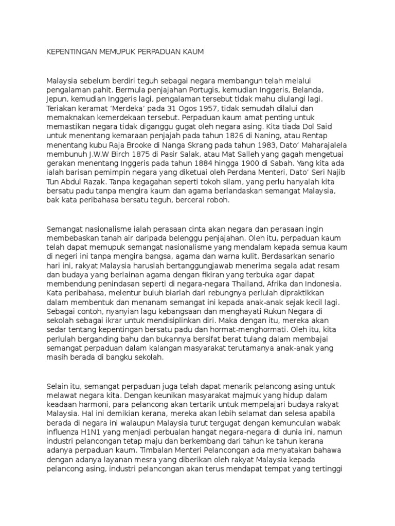 Blog Archives Fasrke from imgv2-2-f.scribdassets.com Kemukakan pendapat anda tentang kepentingan perpaduan kaum di negara kita. Perpaduan merupakan antara keistimewaan yang wujud di malaysia dan penting untuk mencapai status negara maju menjelang tahun 2020. Antara perkara yang diguna pakai oleh kerajaan dalam membentuk perpaduan antara kaum. Konklusinya, pihak kerajaan perlulah mengadakan pelbagai program atau aktiviti yang dapat memupuk semangat perpaduan kaum. Intihannya, masayrakat yang memupuk semangat kejiranan dapat melaksanakan sesuatu pekerjaan dengan lebih cekap dan menghasilkan sesuatu yang berfaedah untuk semua. Satu identiti bangsa juga penting. Bersama bagi memupuk semangat cinta akan negara serta sanggup berkorban untuk kepentingan. Sesungguhnya, semangat patriotisme akan membentuk rakyat yang lebih mementingkan kepentingan negara daripada kepentingan kaum.
