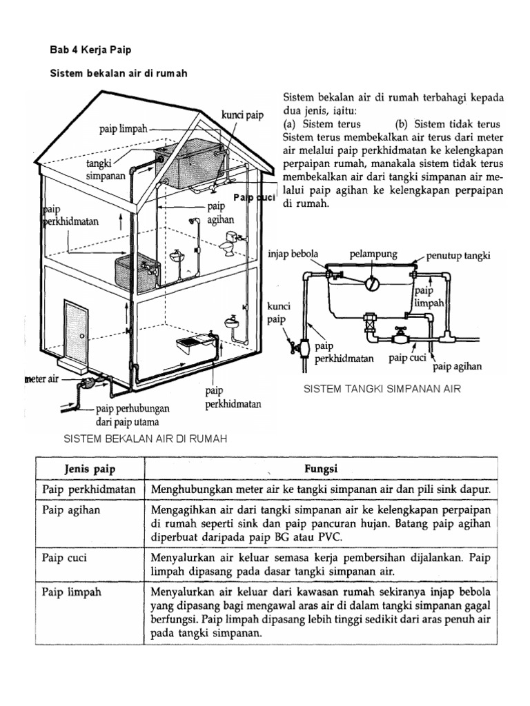 Sistem pembekalan panas dan air sejuk seperti kedudukan pemanas air dan tangki air panas di dalam atau di luar bangunan. 5.7 sistem bekalan air (sains tingkatan 2) 1. Air dipam ke sistem pengudaraan untuk melarutkan oksigen dan menghilangkan bau. • basuh pinggan di dalam sinki yang diisi dengan air, bukan dengan air yang mengalir dari pili air. Dapat membekalkan air yang bersih dan segar, mempunyai tekanan air yang sangat tinggi sertaia tidak akan mengalami limpahan air pada tangki simpanan kalau injap bebola rosak dan tidak merugikan air kerana tangki simpanan tidak perlu di sediakan.