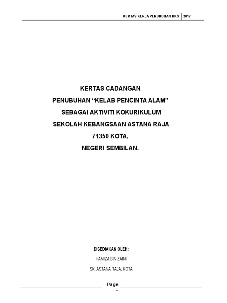 Penyertaan murid tahun 4, 5 dan 6 penasihat josephine jata anak salih alamat sk saint mark (m) pejabat pendidikan daerah selangau, lot 363, blok 15 selangau new township, 96000 sibu, sarawak malaysia kategori kelab hobi dan rekreasi kertas cadangan penubuhan kelab pencinta alam 2 sk saint mark (m), selangau 1.0 pengenalan kelab pencinta alam merupakan merupakan satu inisiatif daripada pihak sekolah untuk mewujudkan generasi yang penyayang tehadap alam sekitar. Kelab usahawan ppki telah ditubuhkan sejak tahun 2010. Kelab seni budaya dan perfileman. Contoh borang penilaian prestasi pelajar contoh borang soal selidik produk makanan contoh borang soal selidik masyarakat setempat contoh borang senarai semak prasekolah contoh borang kajian keperluan pelanggan rbt contoh borang penilaian prestasi kerja contoh borang permohonan cuti sakit. Tujuan kertas kerja ini dikemukakan untuk mendapatkan pertimbangan dan kelulusan pihak pentadbir sekolah menengah kebangsaan sikuati bagi menubuhkan kelab seni budaya asrama semeksi dan memohon dana untuk. Othman ) setiausaha kelab bolasepak sekolah kebangsaan lahar kepar. Contoh aktiviti tahunan kelab pusat sumber sekolah. Kertas cadangan penubuhan kelab seni budaya asrama semeksi (kesendamaksi) sebagai aktiviti kokurikulum di asrama sekolah menengah. Kertas kerja penubuhan kks 2017 kelab pencinta alam sekolah kebangsaan astanja raja no. Contoh kertas kerja cadangan penubuhan kelab pusat sumber sekolah. Contoh garis panduan kelab pusat sumber sekolah; Kertas cadangan penubuhan kelab sahabat kertas kerja penubuhan kelab sahabat. Naib yang di pertua, majlis perwakilan pelajar (mpp) no.